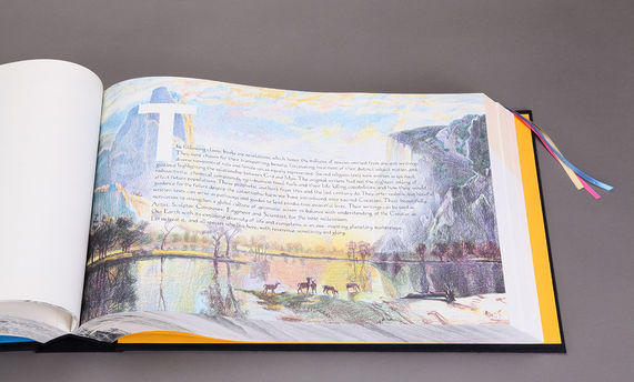 The first page of each book features illuminations after masters of landscape painting and hand calligraphy in the style of a holy manuscript. Verse numbers appear throughout the texts in both the religious and environmental writings, for readers to cite and study.